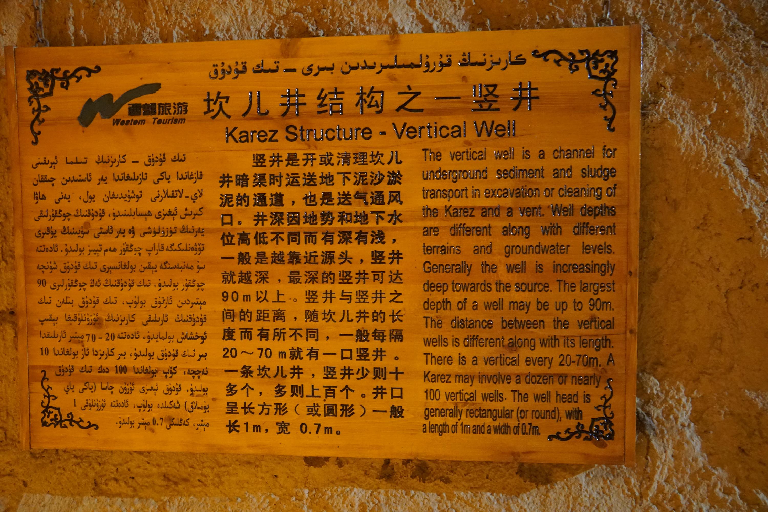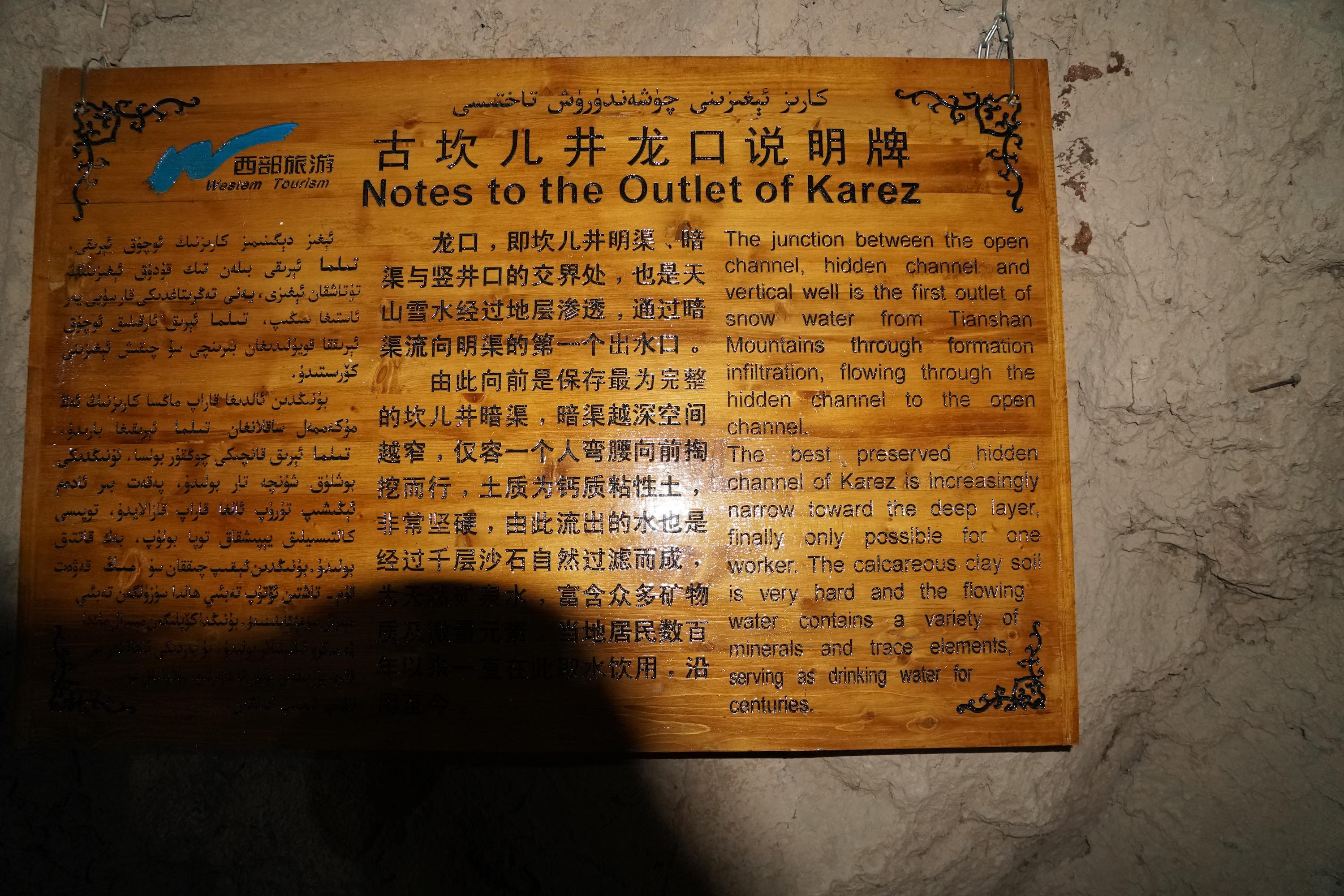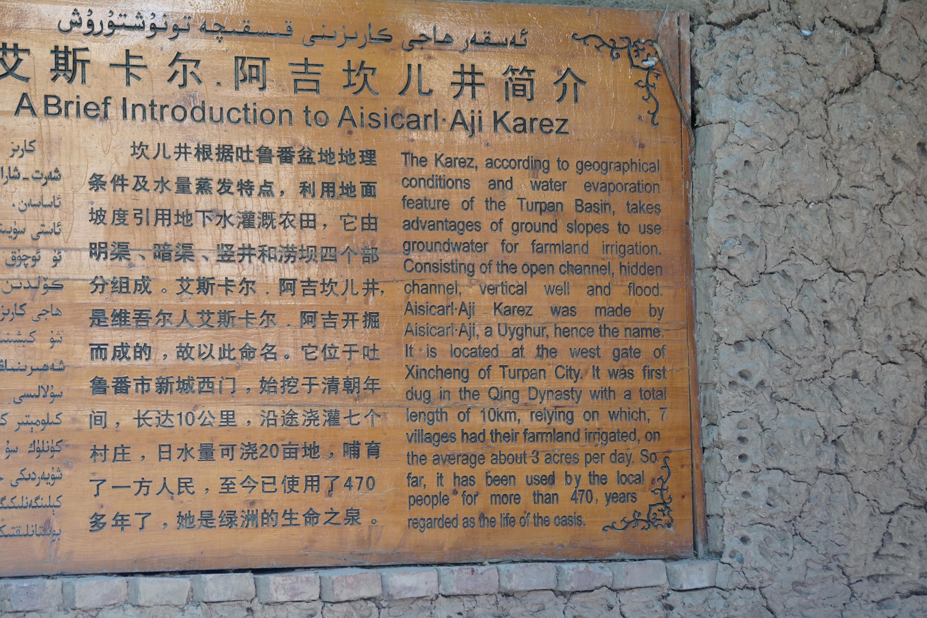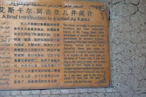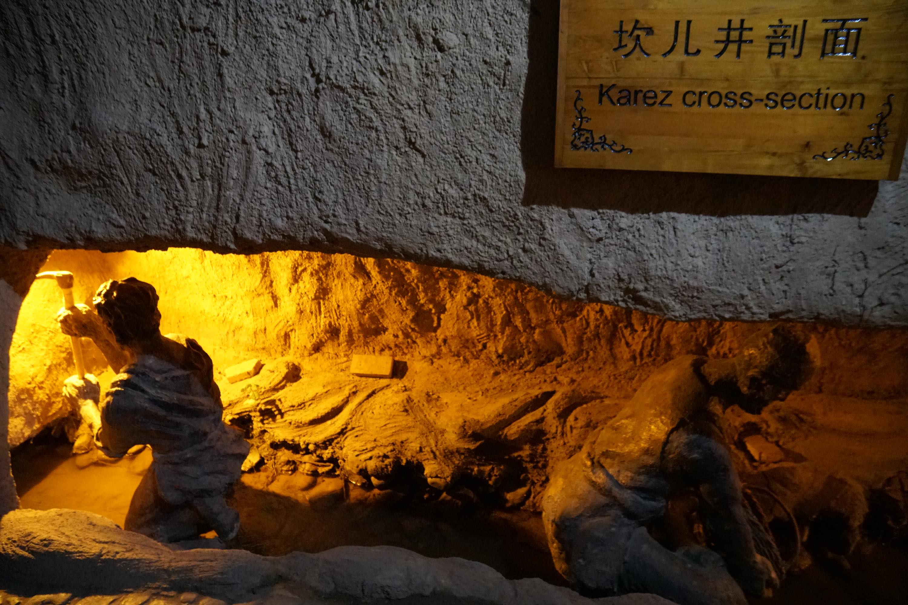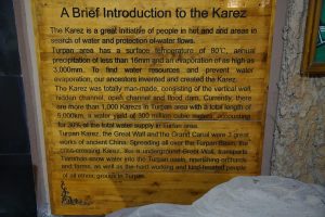 Viele Oasen hier werden mit dem Karez-Bewässerungssystem mit Wasser versorgt. Dabei wird Wasser von den Bergen in unterirdischen Tunnels in die Wüste geleitet. Ich war in einem Karez Museum in Turpan.