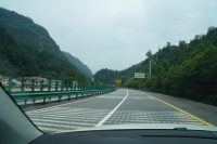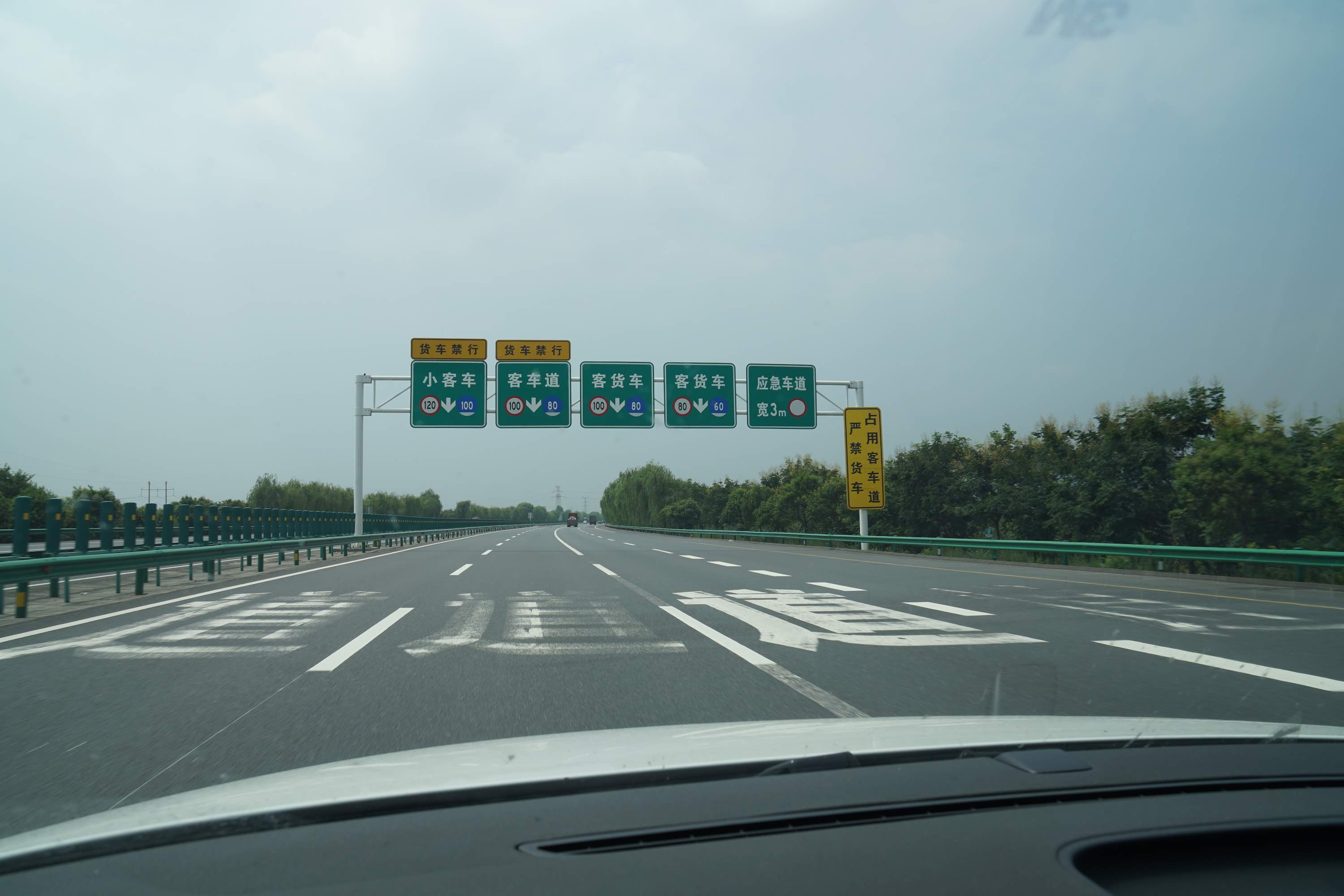 Such signs are commonplace (often also with English – also for 100, 80 km/h): Left: cars, then bus, then on the right two truck lanes and the emergency lane. I think that is totally illogic: Unfortunately there are many car drivers that drive slower than the max speed (e.g. here 110. Why? I don’t know. Save on fuel? Maybe insecure/ newbie drivers?) – on the left lane. If I wanted to overtake them (overtaking on the right is OK – I think – everybody is doing it) I’d have to go on the 100 km/h lane … but couldn’t overtake the 110 car anymore then. But it seems in China such rules are anyways made to be broken (people quite often ignore traffic rules here – e.g. the „non-overtaking line“ is often ignored – also because those can be extremely long).